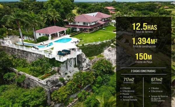It has two houses built, one measuring 717 m2 and 2 levels with 6 bedrooms, a large pool with ocean views, and a covered terrace with 360-degree views of the ocean and the property. Additionally, it has another house measuring 677 m2 and 5 bedrooms. It also has a 30,000-gallon water reserve tank.